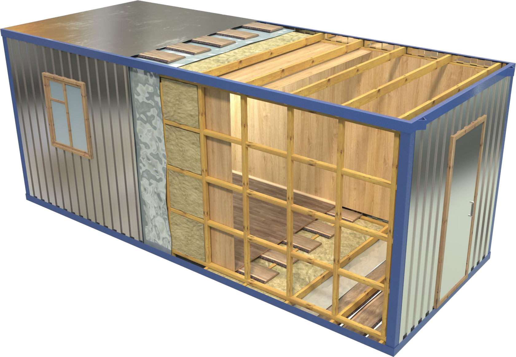 КаркасБытовки имеют полноразмерный металлический каркас 6000 х 2400 х 2600 мм.
